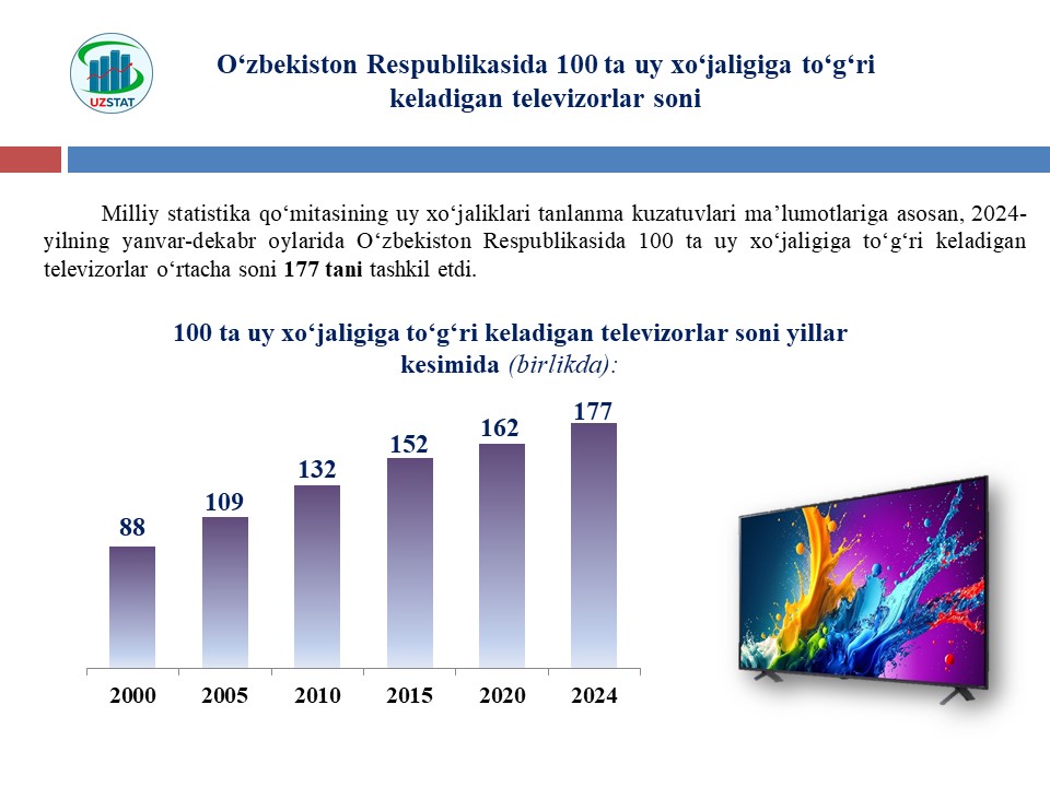 O‘zbekiston Respublikasida 100 ta uy xo‘jaligiga to‘g‘ri keladigan televizorlar soni