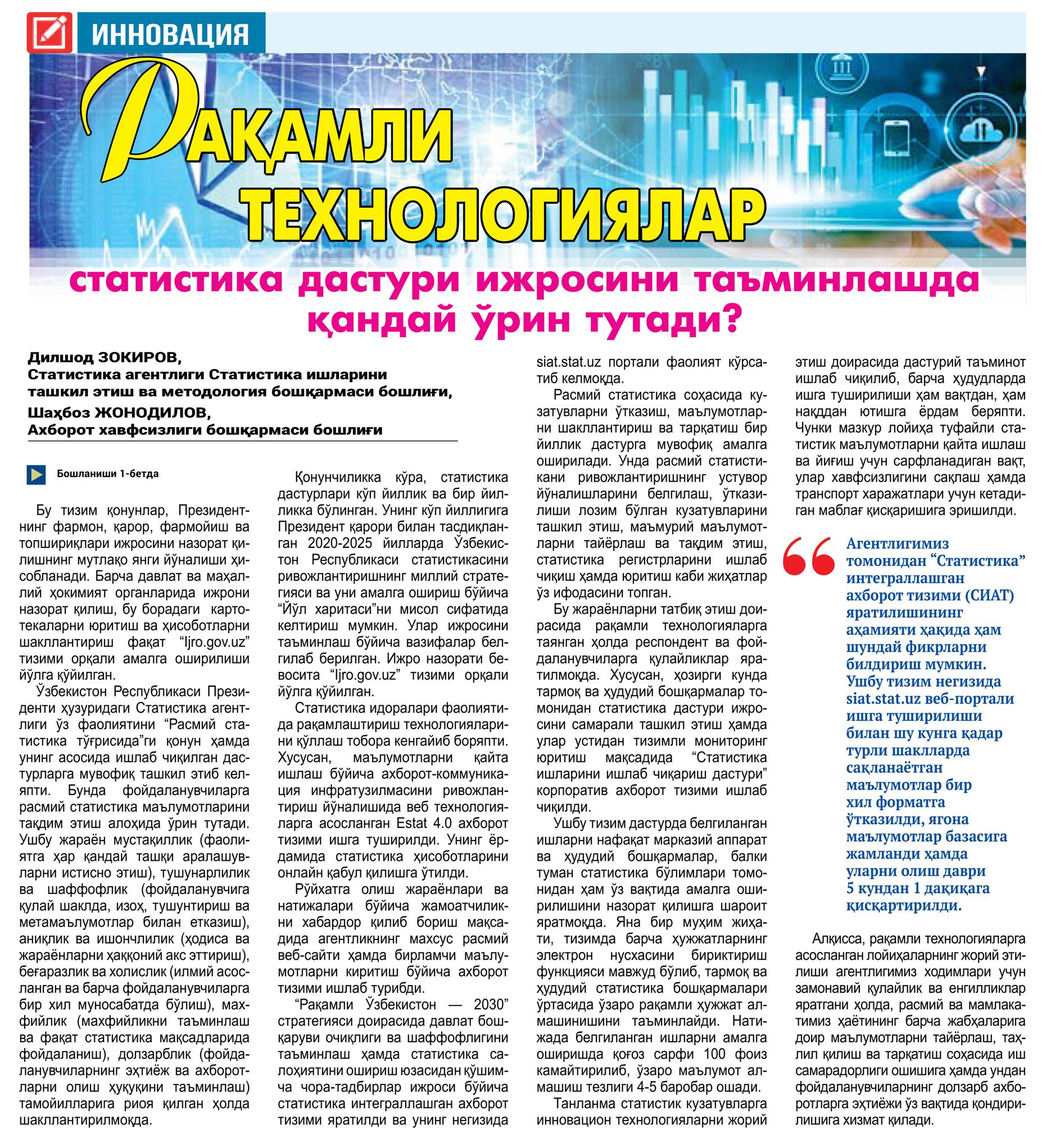 “Янги Ўзбекистон” gazetasining 2023-yil 29-apreldagi 82-sonida Oʻzbekiston Respublikasi Prezidenti huzuridagi Statistika agentligi boshqarma boshliqlari D.Zokirov va Sh.Jonodilovning “Raqamli texnologiyalar statistika dasturi ijrosini taʼminlashda qanday oʻrin tutadi?” nomli maqolasi chop etildi