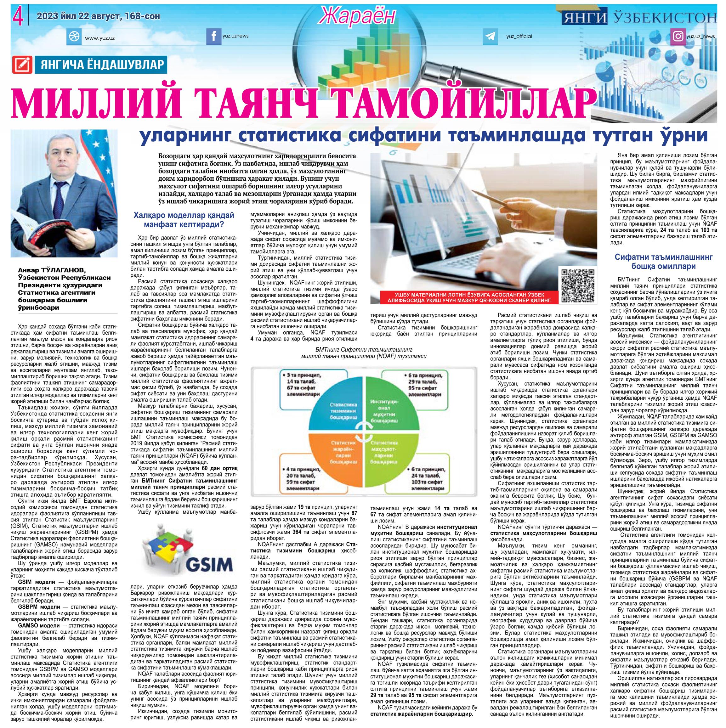 “Янги Ўзбекистон” gazetasining 2023- yil 22- avgustdagi 168- sonida Oʻzbekiston Respublikasi Prezidenti huzuridagi Statistika agentligi boshqarma boshligʻi oʻrinbosari Anvar To‘laganovning “Milliy tayanch tamoyillar: ularning statistika sifatini ta’minlashda tutgan o‘rni” nomli maqolasi chop etildi.