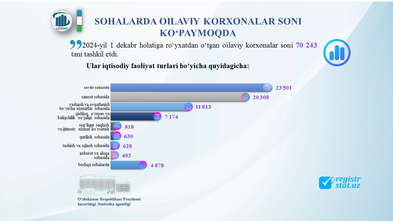 Toshkent viloyatida faoliyat ko‘rsatayotgan korxona va tashkilotlar soni 2024- yil 1-dekabr holatiga 43,2 mingtaga yetdi