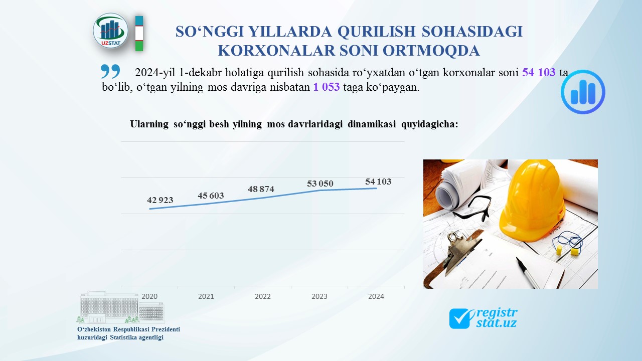 2024- yil yanvar-noyabr oylarida Toshkent viloyatida yangi tashkil etilgan korxona va tashkilotlar soni 6 566 tani tashkil etdi
