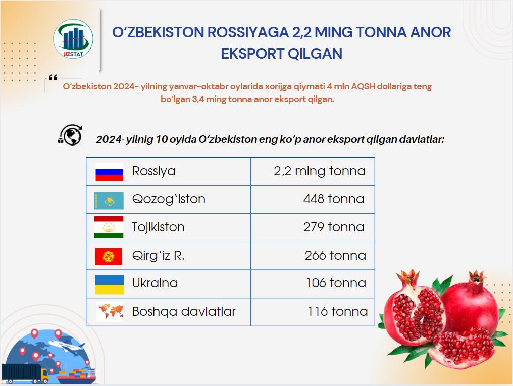 2024- yil yanvar-oktabr oylarida Toshkent viloyati bo‘yicha 1 mln AQSh dollariga teng 0,7 ming tonnadan ortiq yeryon-g'oqlar eksporti amalga oshirilgan