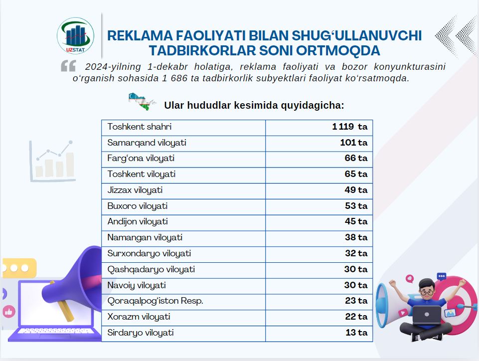 Joriy yilning 11-dekabr kuni Oʻzbekiston Respublikasi Prezidenti huzuridagi Statistika agentligida Qoraqalpogʻiston Respublikasi, viloyatlar va Toshkent shahar statistika boshqarmalarining Statistik registrlarni yuritish boʻlimi xodimlari uchun korxona va tashkilotlar yagona davlat registri (KTYADR) bazasini shakllantirish va ularni yuritish masalalariga oid ishlar holati va kelgusidagi ustuvor vazifalar yuzasidan onlayn vebinar tashkil etildi