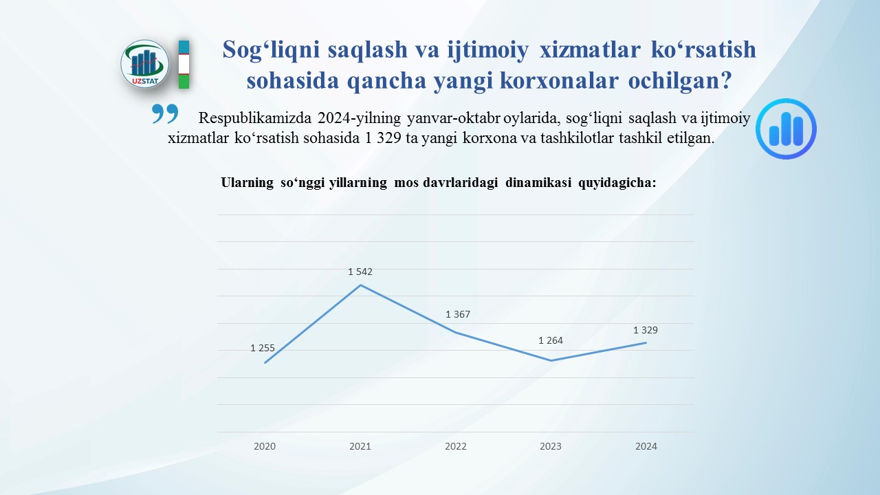 2024- yilning yanvar-oktabr oylarida yangi tashkil etilgan korxona va tashkilotlar jami 6 076 ta (fermer va dehqon xo‘jaliklarisiz) bo‘lib