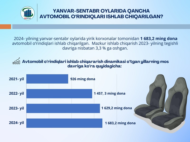 2024- yilning yanvar oyida yirik korxonalar tomonidan 1 683,2 ming dona avtomobil oʻrindiqlari ishlab chiqarilgan