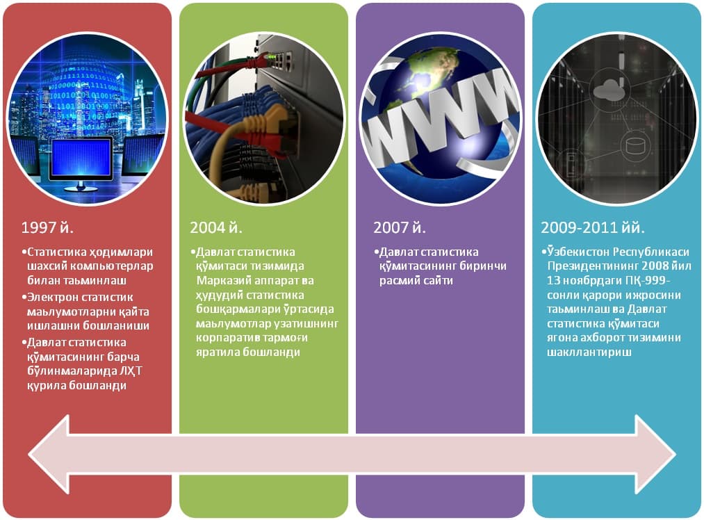 Давлат статистика қўмитасида 1997 йилда биринчи марта АКТ ҳақида сўз юритила бошлади. Айнан ўша йилдан бошлаб статистика ҳодимлари шахсий компьютерлар билан таьминлана бошланди ва ушбу жараён статистик маълумотларни электрон шаклда қайта ишлашга ўтиш учун биринчи қадам бўлди. Давлат статистика қўмитасининг барча бўлинмаларида локал ҳисоблаш тармоқлари қурила бошланди. 2003 йилга қадар статистика органларини босқичма-босқич ҳисоблаш техникаси билан таьминланди ва статистик маьлумотларни қайта ишлаш учун дастурий комплексларни яратиш, такомиллаштириш ишлари амалга оширилди.