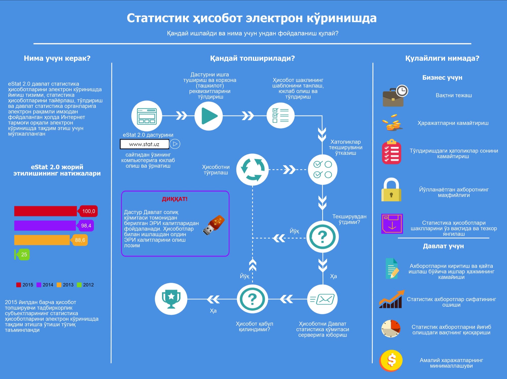 2015 йилдан бошлаб барча ҳисобот топширувчи тадбиркорлик субъектларининг электрон шаклда статистик хисоботларни тақдим этишига тўлиқ ўтилиши таъминланди.
