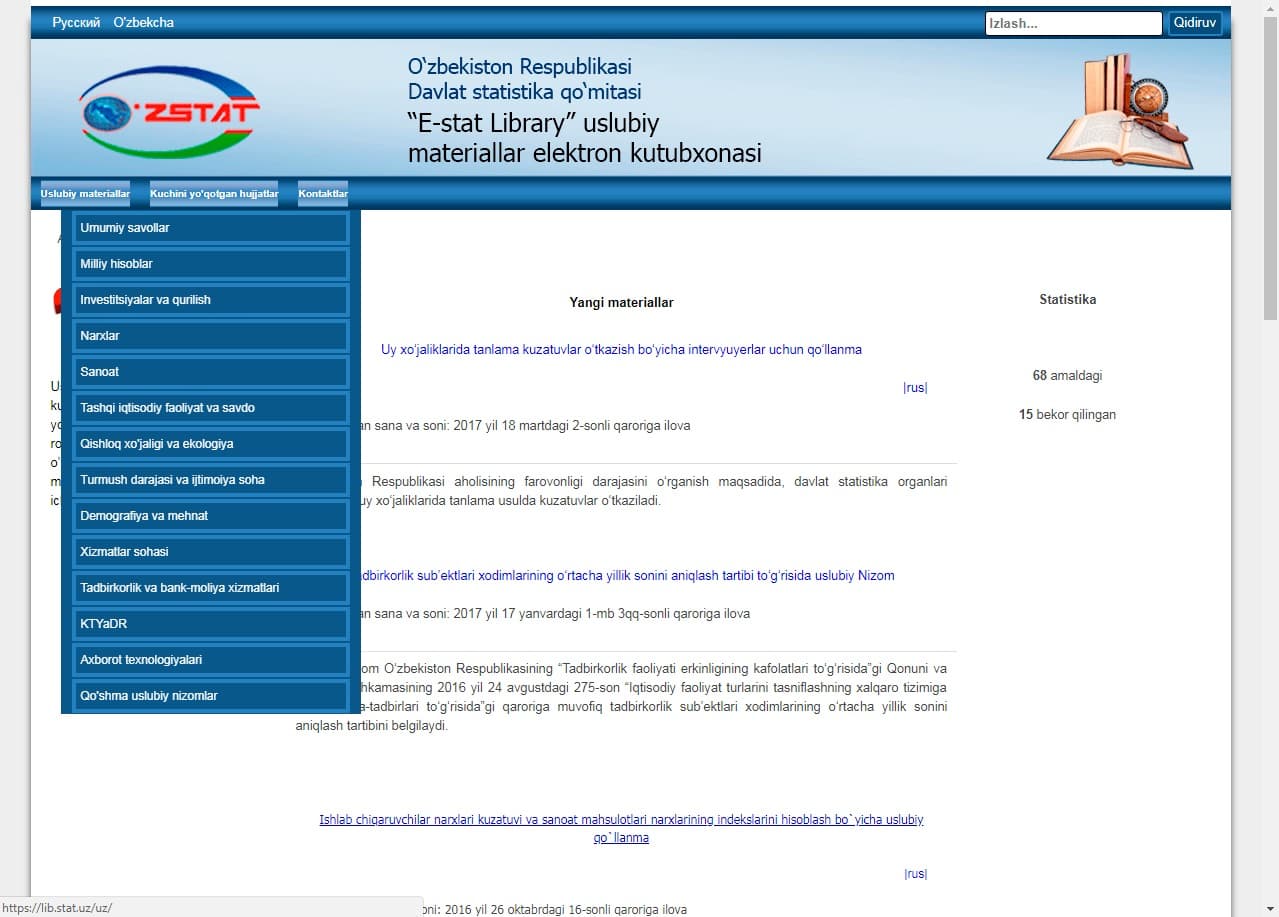 «E-stat Library» - услубий материалларнинг электрон кутубхонаси, услубий низомлар ва йўриқномаларнинг тизимлаштирилган рўйхатини, статистик кузатувлар ўтказиш ва ташкиллаштириш масалаларини регламентлашни ўз ичига олади.