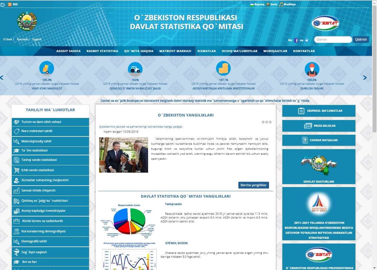 Ҳозирги кунда Давлат статистика қўмитасининг расмий веб-сайтида саноат тармоқларини, миллий иқтисодиёт ва ҳудудий соҳаларини ривожлантириш, ҳамда ислоҳотларни чуқурлаштириш, иқтисодиётни либераллаштириш, ишлаб чиқариш технологияларини қайта жиҳозлаш ва модернизация қилиш, ҳом-ашёни чуқур қайта ишлаш, республика ҳудудларини умумий ривожланиши, аҳоли турмуш даражасини янада яхшилаш бўйича қабул қилинган дастурларни амалга ошириш жараёнини янада тўлиқроқ тавсифлайдиган, тезкор ва аниқ статистик маълумотлар эълон қилинмоқда.