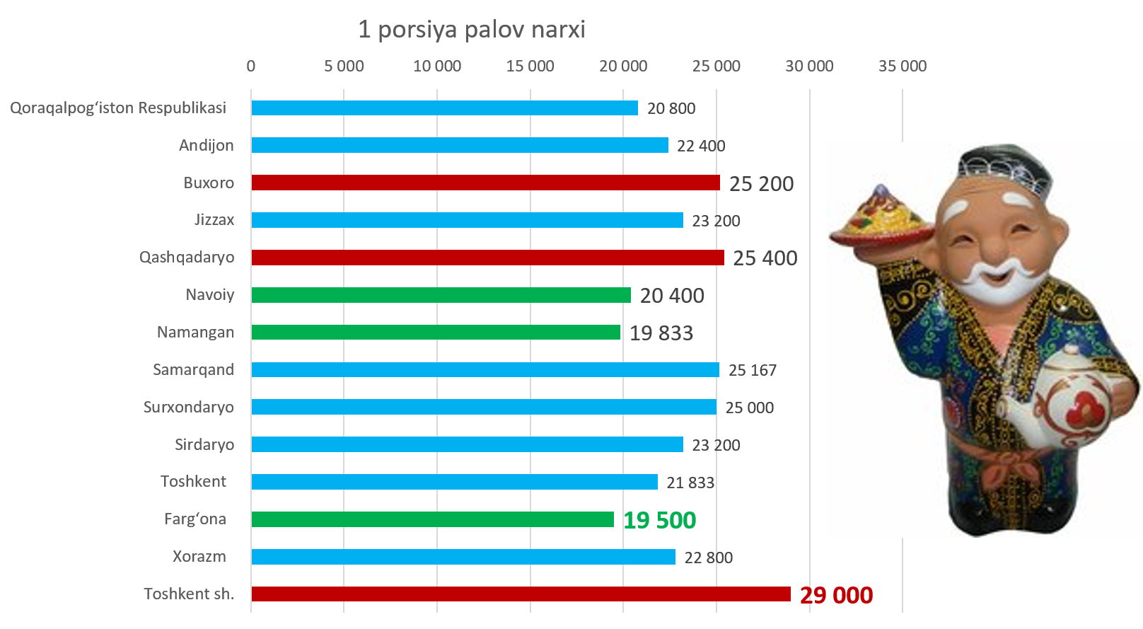 Statistika agentligi tomonidan, mamlakatimizning markaziy hududlaridagi umumiy ovqatlanish muassasalari (Osh markazlari)da o‘tkazilgan kuzatuv natijalari bo‘yicha, palovning o‘rtacha narxlari quyidagi ko‘rinishga ega bo‘ldi: