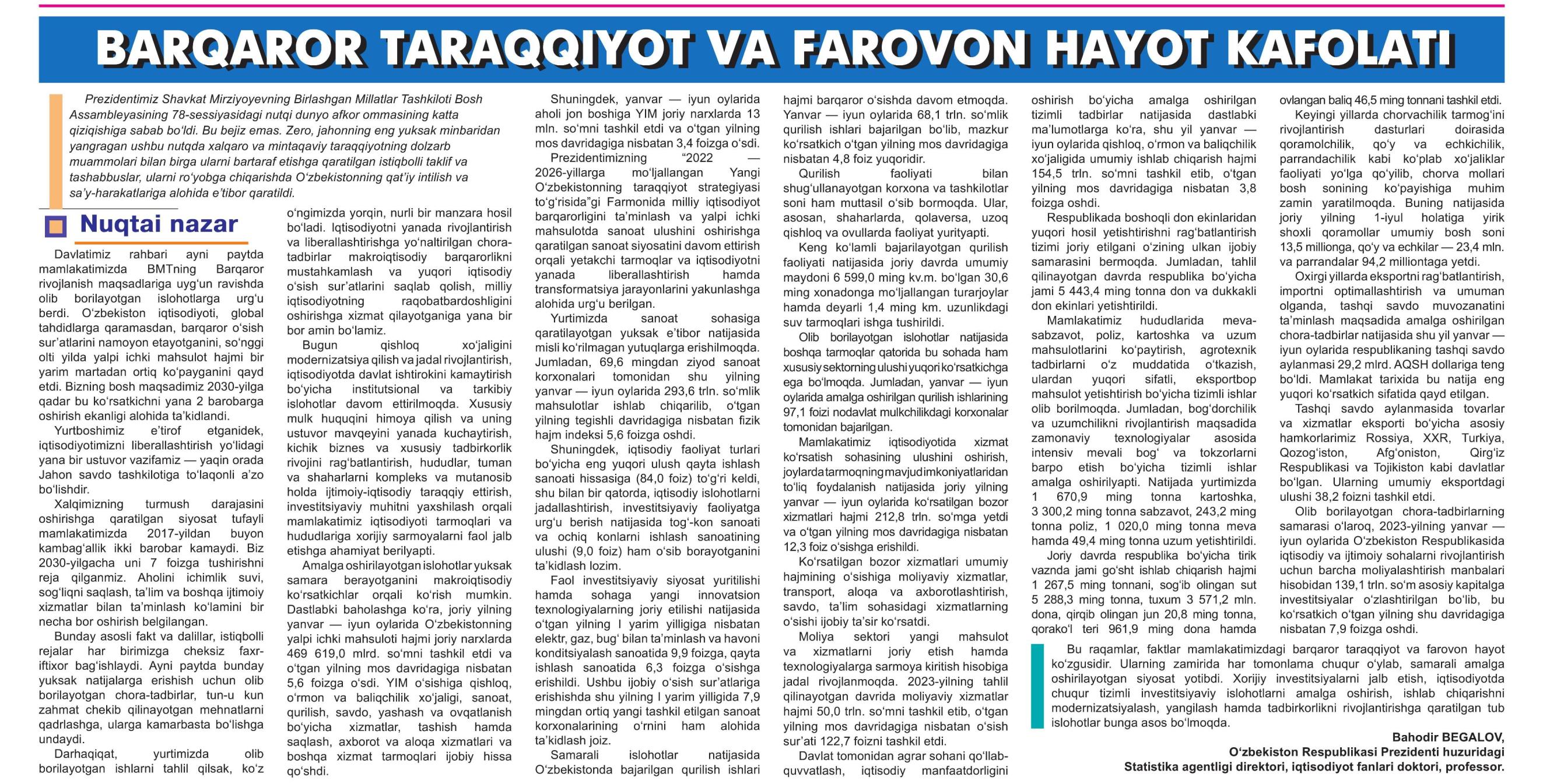 “Xalq soʻzi” gazetasining 2023-yil 26-sentabrdagi 201-sonida Oʻzbekiston Respublikasi Prezidenti huzuridagi Statistika agentligi direktori, iqtisodiyot fanlari doktori, professor Begalov Bahodir Abdusalomovichning “Barqaror taraqqiyot va farovon hayot kafolati” nomli maqolasi chop etildi.