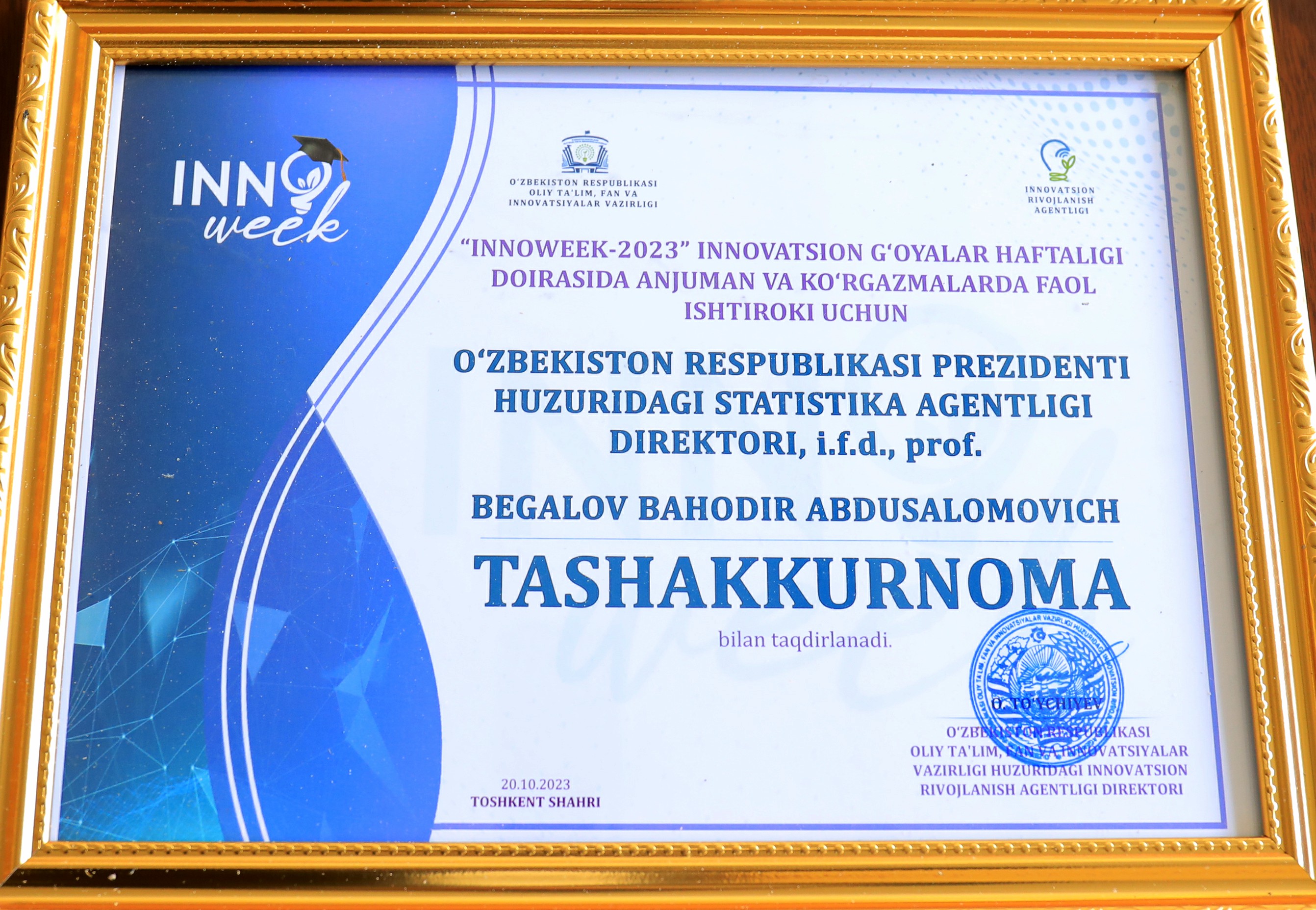 Xususan, O‘zbekiston Respublikasi Prezidenti huzuridagi Statistika agentligi direktori, iqtisodiyot fanlari doktori, professor Begalov Bahodir Abdusalomovich hafdalik doirasida faol ishtiroki uchun taqdirlandi.