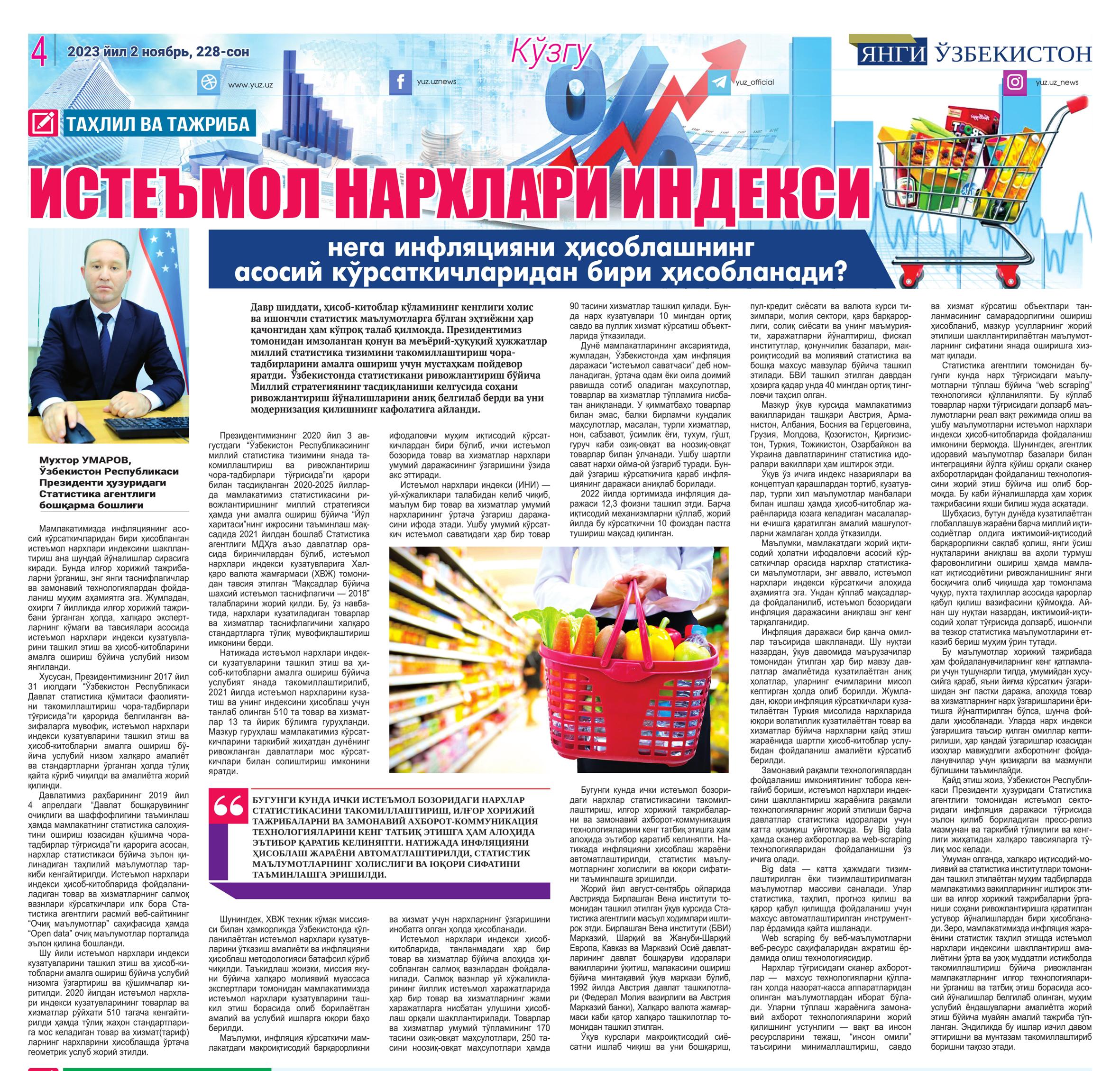 “Янги Ўзбекистон” gazetasining 2023-yil 2-noyabrdagi 228-sonida Oʻzbekiston Respublikasi Prezidenti huzuridagi Statistika agentligi boshqarma boshligʻi Muxtor Umarovning “ Isteʼmol narxlari indeksi nega inflyatsiyani hisoblashning asosiy koʻrsatkichlaridan biri hisoblanadi?” nomli maqolasi chop etildi.