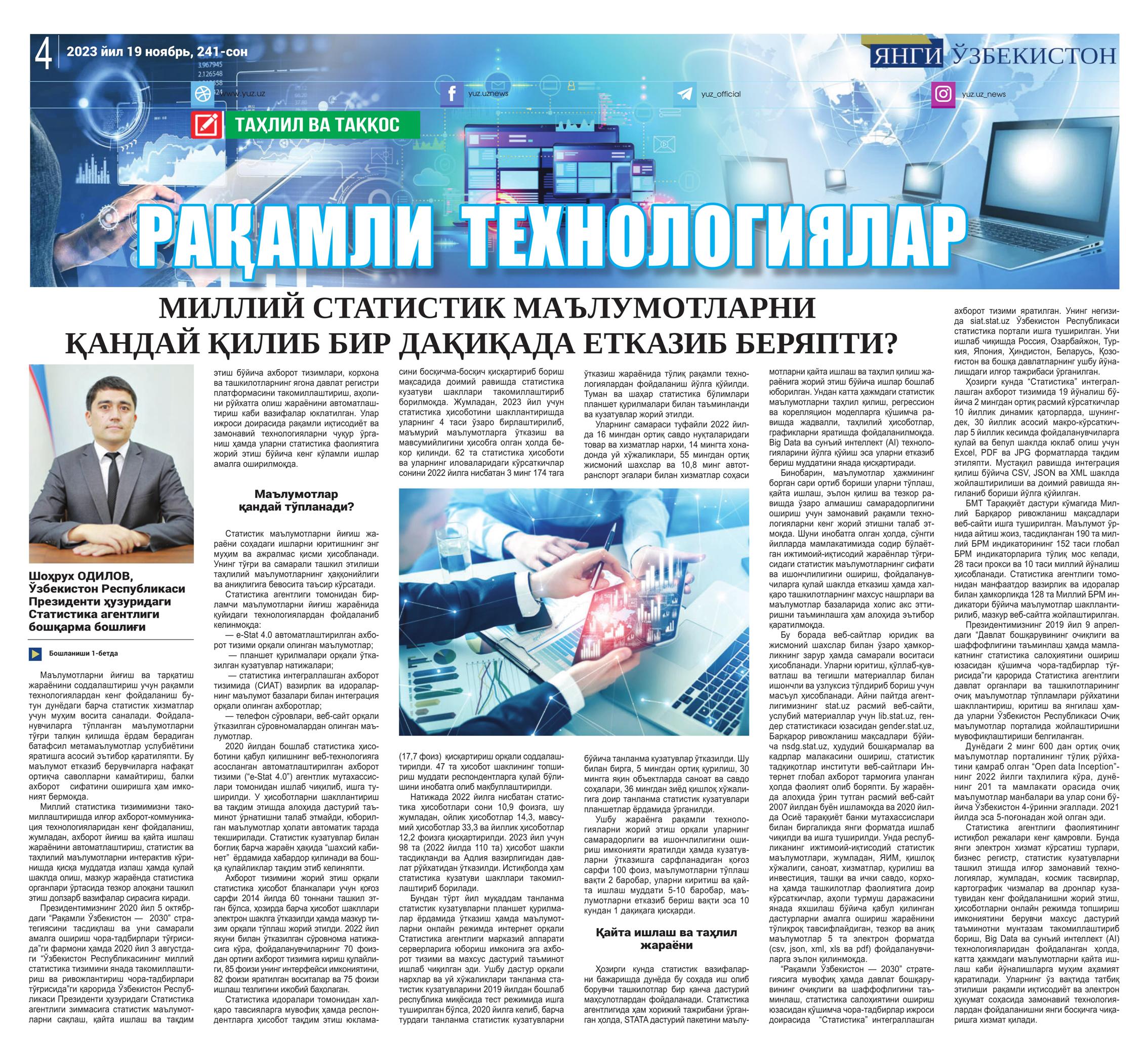 “Янги Ўзбекистон” gazetasining 2023-yil 19-noyabrdagi 241-sonida Oʻzbekiston Respublikasi Prezidenti huzuridagi Statistika agentligi boshqarma boshligʻi Shohrux Odilovning “Raqamli texnologiyalar milliy statistik maʼlumotlarni qanday qilib bir daqiqada yetkazib beryapti?” nomli maqolasi chop etildi.