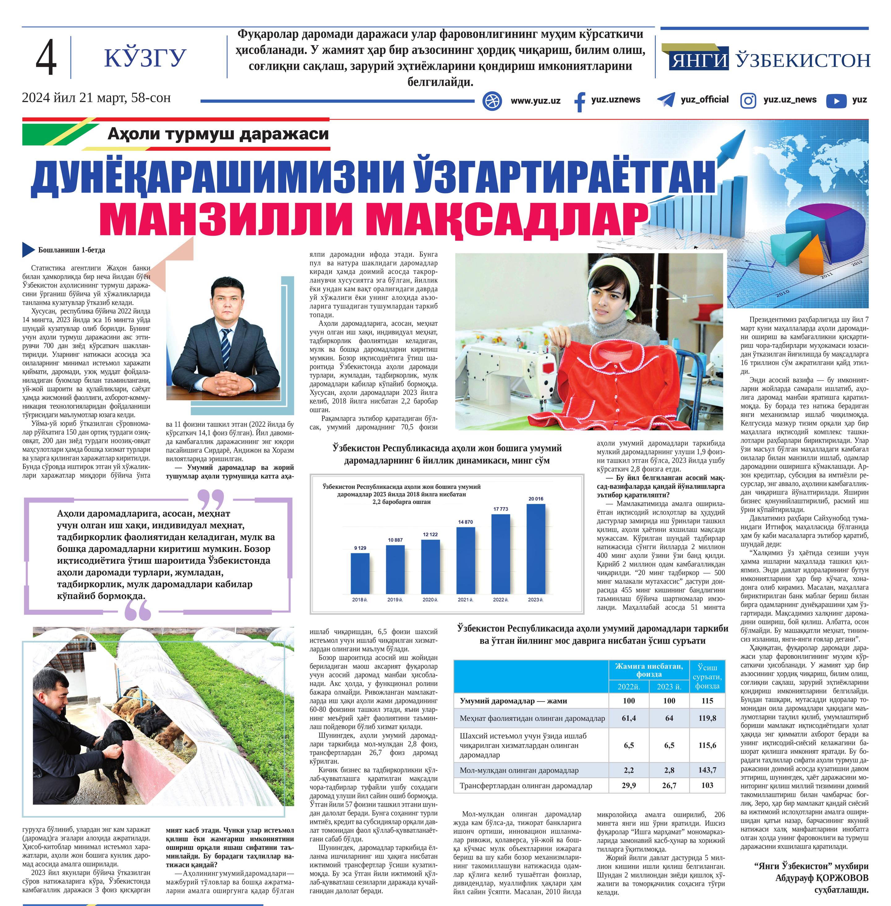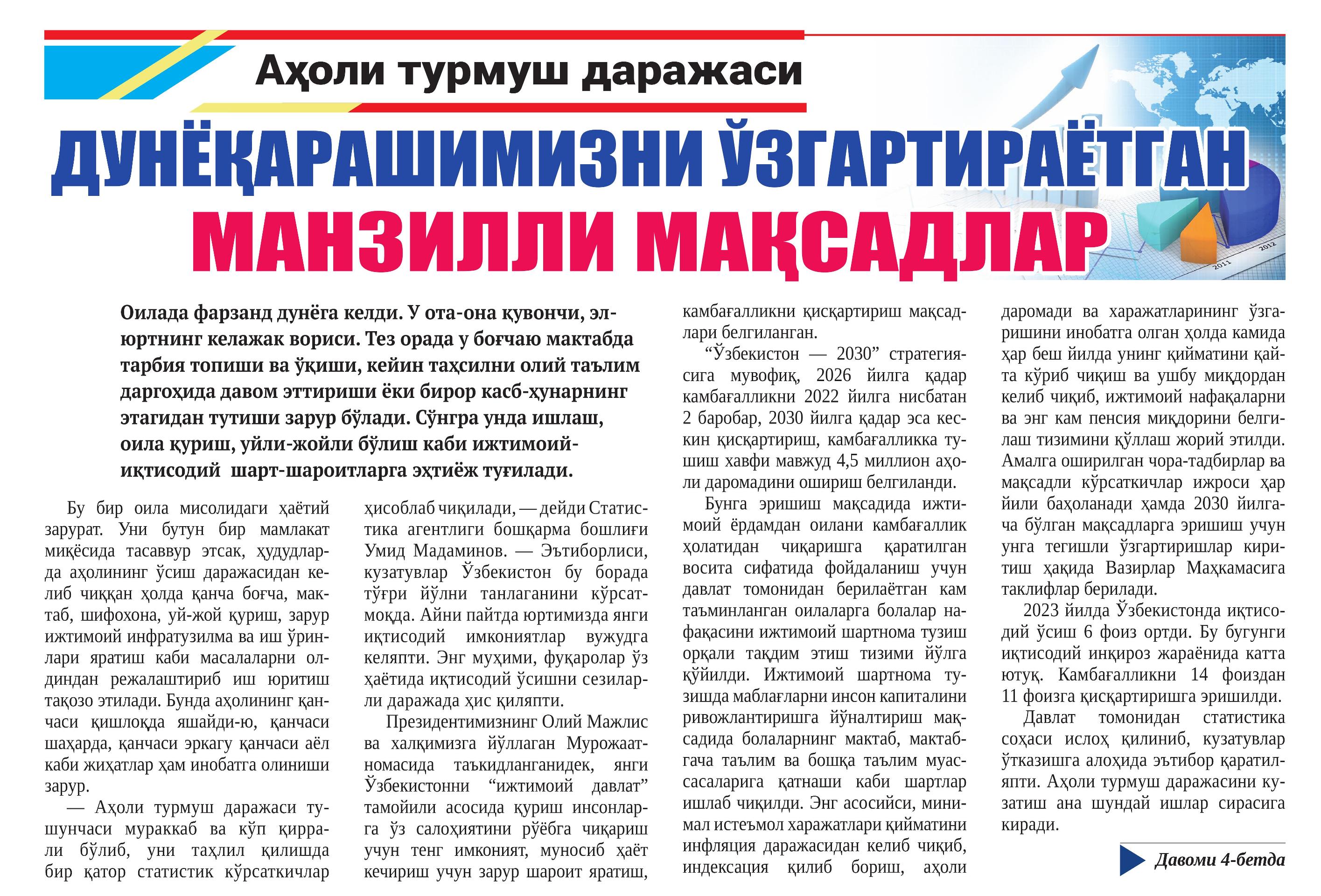 “Yangi Oʻzbekiston” gazetasining 2024-yil 21-martdagi 58-sonida Oʻzbekiston Respublikasi Prezidenti huzuridagi Statistika agentligi Aholi turmush darajasi va kuzatuvlari statistikasi boshqarmasi boshligʻi Umid Madaminovning “Dunyoqarashimizni oʻzgartirayotgan manzilli maqsadlar” nomli maqolasi chop etildi.