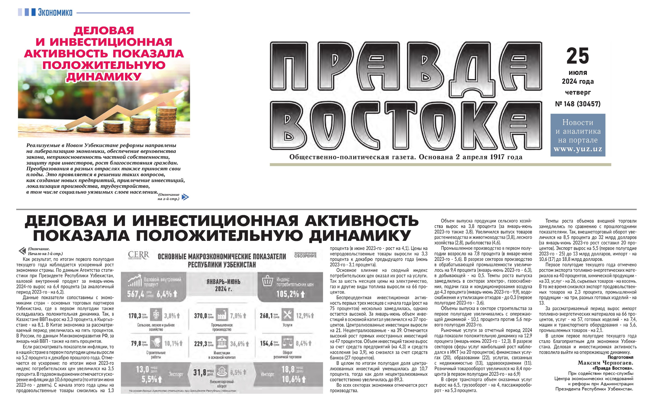 “Правда Востока” gazetasining 2024-yil 25-iyuldagi 148-sonida Oʻzbekiston Respublikasi Prezidenti huzuridagi Statistika agentligining maʼlumotlari asosida “Biznes va investitsiya faoliyati ijobiy dinamikani koʻrsatdi” nomli maqola chop etildi.