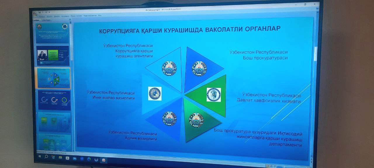 Seminarda boshqarma bosh yuristkonsulti K.Urazbayev tomonidan hozirgi kunda mamlakatimizda korrupsiya illatiga qarshi kurashish masalasida olib borilayotgan amaliy ishlar hamda qabul qilingan meyoriy hujjatlar toʻgʻrisida, korrupsiya har qanday davlat va jamiyatning siyosiy-iqtisodiy rivojlanishiga jiddiy putur yetkazishini, davlatning konstitutsiyaviy asoslarini va qonun ustuvorligini zaiflashtirib, oqibatda inson huquq va erkinliklarining poymol bo‘lishiga olib kelishi aytib o‘tildi. Bunnan tashqari Korrupsiya holatlariga yo‘l qo‘ymaslik to‘g‘risida boshqarma tomonidan muntazam ravishda tushuntirish ishlari olib borilmoqda.