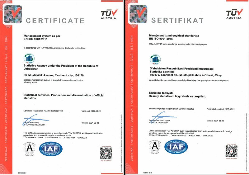 Buning natijasida, Statistika agentligining statistika faoliyati, shu jumladan, rasmiy statistikani tayyorlash va tarqatish faoliyati “ISO 9001:2015 sifat menejmenti tizimi” xalqaro sertifikatsiya jarayonidan muvaffaqiyatli oʻtdi.