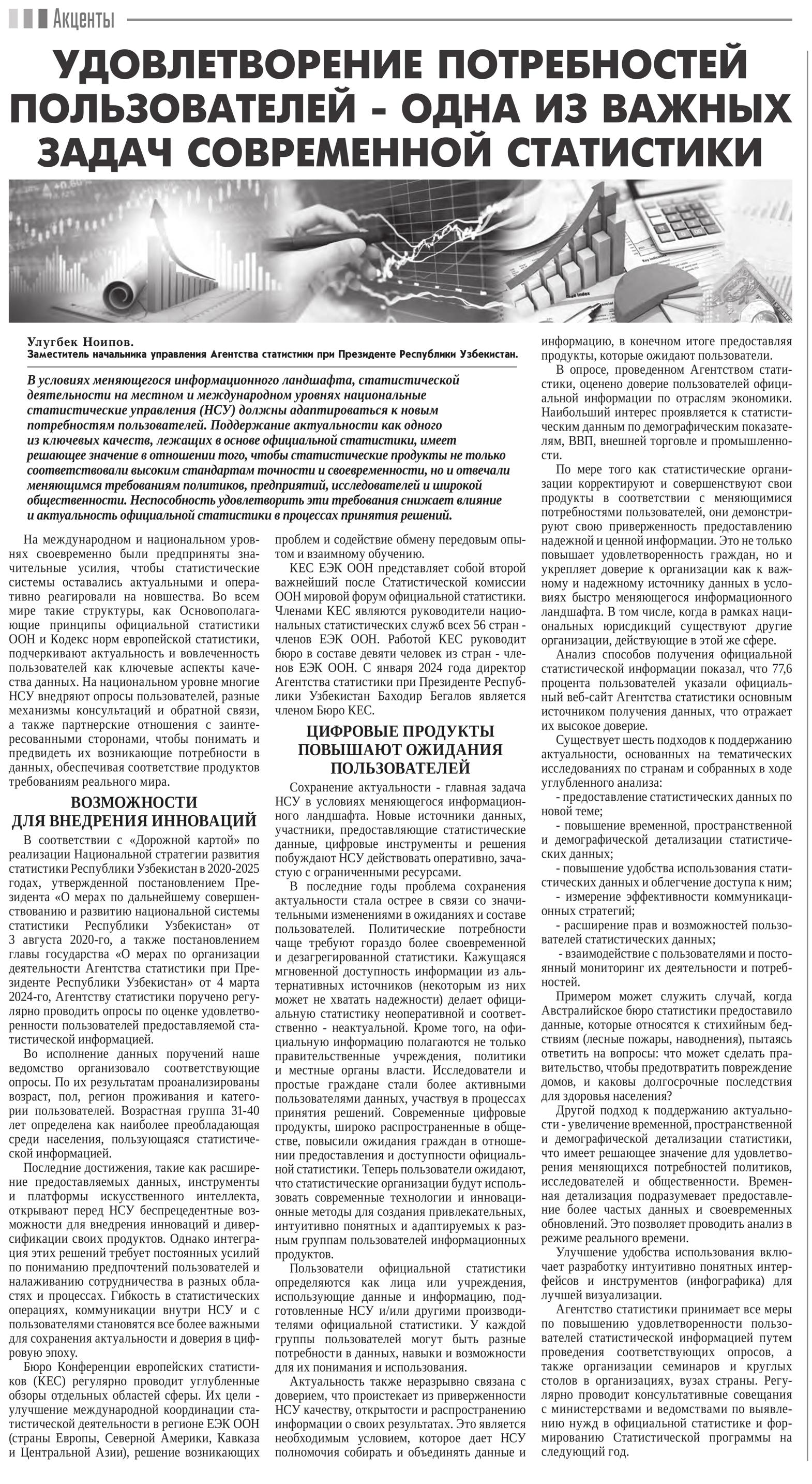“Правда Востока” gazetasining 2024-yil 21-noyabrdagi 236-sonida Oʻzbekiston Respublikasi Prezidenti huzuridagi Statistika agentligi Xalqaro hamkorlik va axborot almashuv boshqarmasi boshlig‘i o‘rinbosari Ulug‘bek Noipovning “Foydalanuvchilarning ehtiyojlarini qondirish – zamonaviy statistikaning eng muhim vazifalaridan biri hisoblanadi” nomli maqolasi chop etildi.