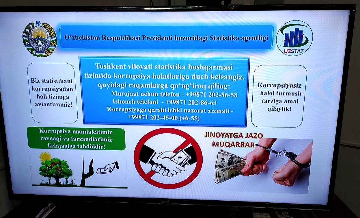 Joriy yilning 26- noyabr kuni Toshkent viloyati statistika boshqarmasida “Korrupsiyaga qarshi kurashish - barchamizning burchimiz” mavzusida seminar o‘tkazildi. Unda Toshkent viloyati statistika boshqarmasi o‘rinbosarlari E.Urunov, X.Igamberdiev, tarmoq bo‘lim boshliqlari hamda hududiy statistika bo‘lim boshliqlari ishtirok etishdi.