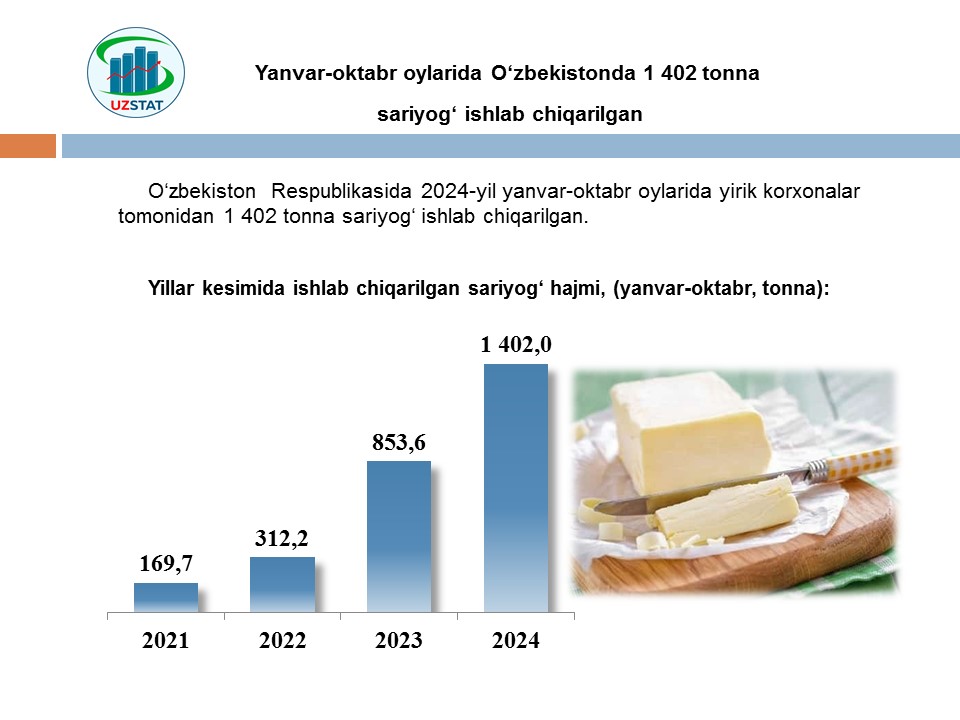 Yanvar-oktabr oylarida Oʻzbekistonda 1 402 tonna sariyogʻ ishlab chiqarilgan