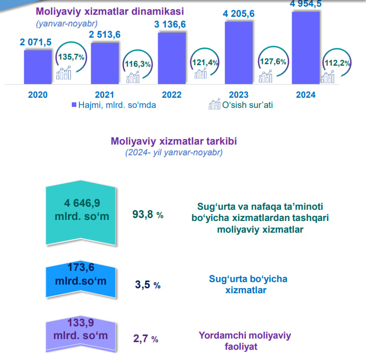 2024- yil yanvar-noyabr oylarida Toshkent viloyatida moliyaviy xizmatlar hajmi 4 954,5 mlrd. so‘mga yetdi. Umumiy bozor xizmatlari hajmida ushbu xizmatlarning ulushi 9,9 % ni tashkil etdi. Jami moliyaviy xizmatlarning o‘sish sur’ati 112,2 % ni tashkil etdi.