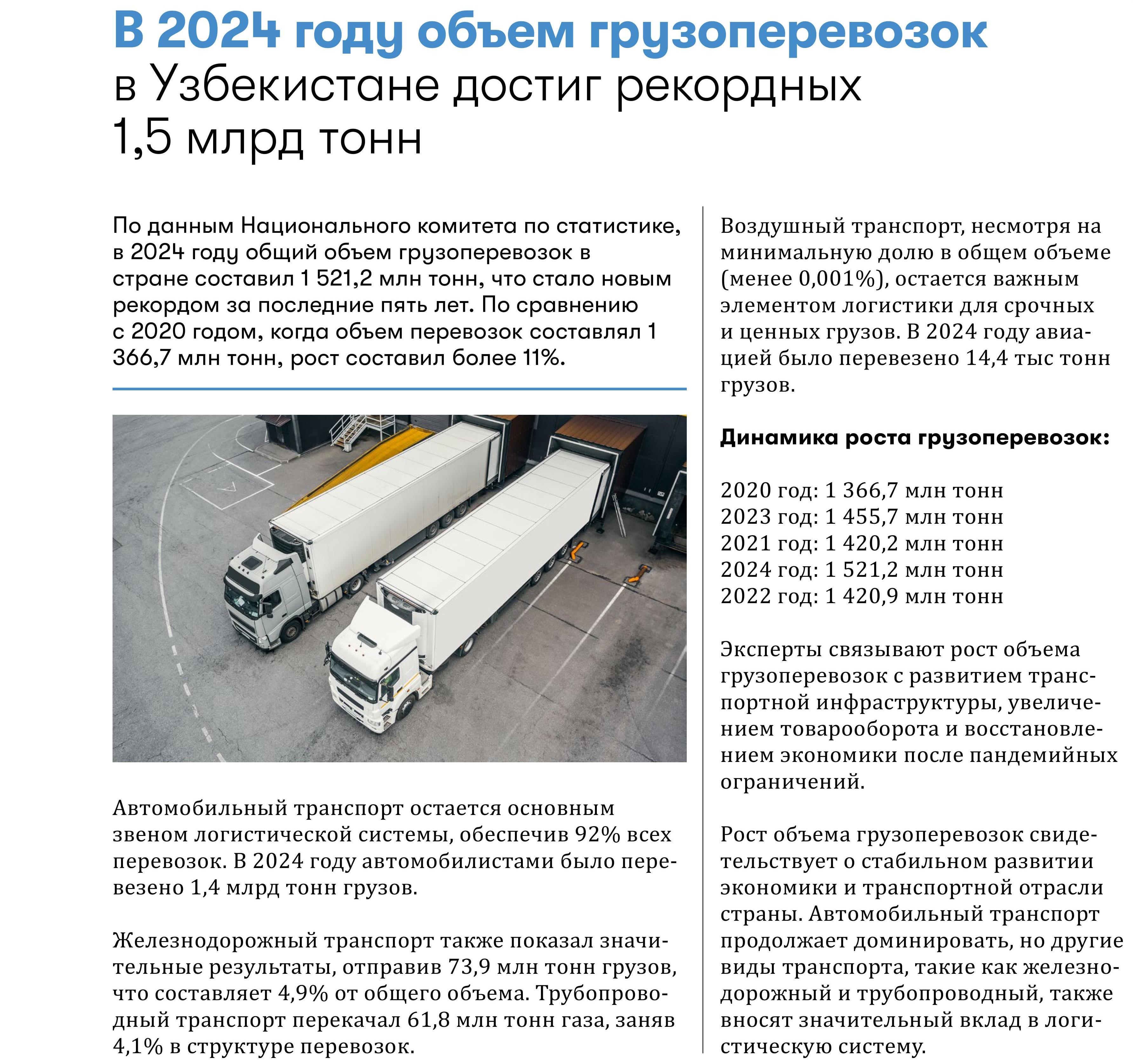 2024-yilda O‘zbekistonda yuk tashish hajmi 1,5 milliard tonnaga yetdi