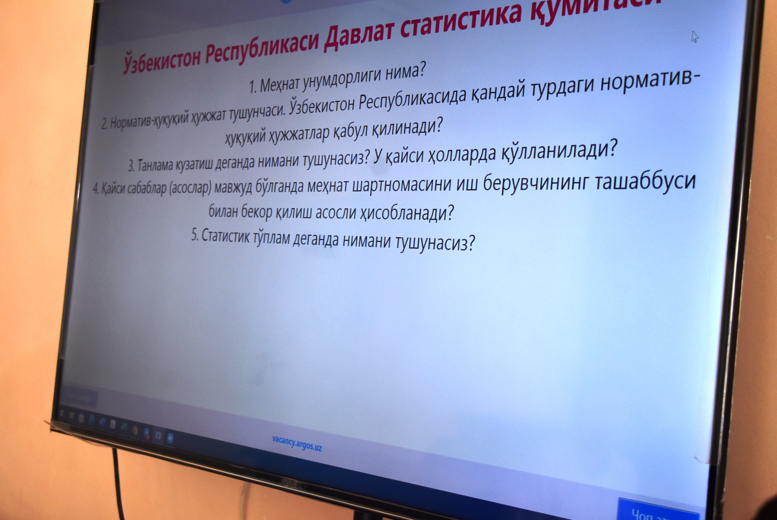 ⚡️Toshkent viloyati statistika boshqarmasida joriy yilning 23- sentyabr kuni Bekobod shahar statistika bo‘limi yetakchi mutaxassisi lavozimiga test jarayonida yuqori ball to’plagan nomzod ochiq va mustaqil tanlovning suhbat bosqichida ishtirok etmoqda.