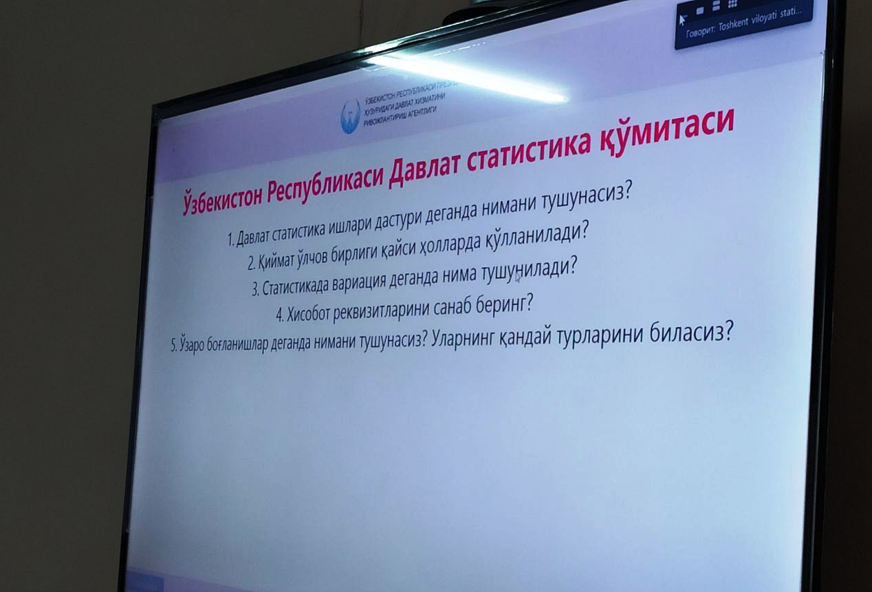 ⚡️Toshkent viloyati statistika boshqarmasida joriy yilning 24- sentabr kuni Sanoat statistikasi bo‘limi bosh mutaxassisi, Tashqi iqtisodiy faoliyat va savdo statistikasi bo‘limi bosh mutaxassisi, Quyi Chirchiq tumani statistika bo‘limi yetakchi mutaxassisi va Bekobod tumani statistika bo‘limi bosh mutaxassisi lavozimlariga test jarayonida yuqori ball to’plagan nomzodlar ochiq va mustaqil tanlovning suhbat bosqichida ishtirok etishmoqda.