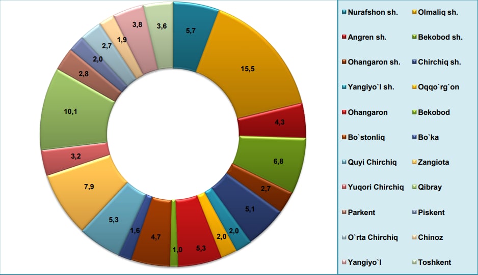 2022- yil yanvar-sentabr oylarida Toshkent viloyatida jami asosiy kapitalga investitsiyalar hajmida hududlarning ulushi: