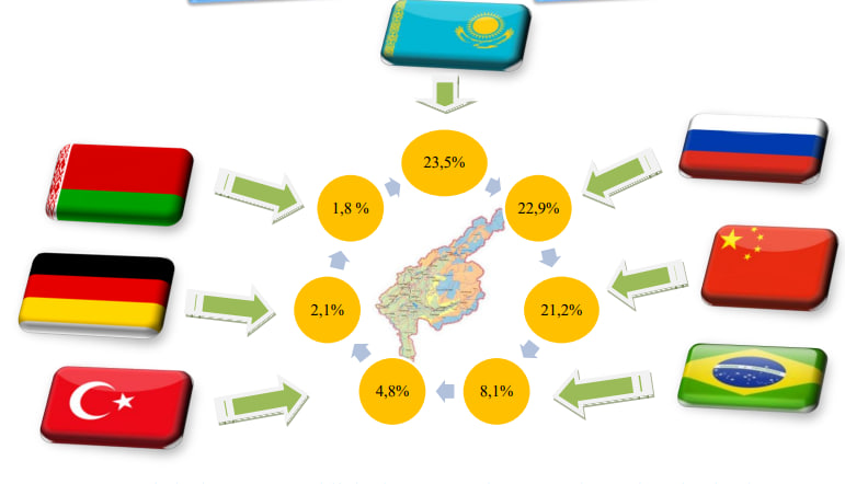 Toshkent viloyatida joriy yilning yanvar-noyabr oylari mobaynida 7 ta eng yirik bo‘lgan Qozog‘izton, Rossiya Federatsiyasi, Xitoy, Braziliya, Turkiya, Germaniya va Belorussiya hamkor davlatlaridan jami import hajmi 2653,9 mln. AQSh dollariga teng bo‘lib, bu umumiy import hajmining 84,5 %ini tashkil qiladi.
