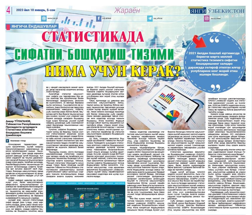 “Янги Ўзбекистон” gazetasining 2023- yil 10- yanvardagi 5- sonida O‘zbekiston Respublikasi Prezidenti huzuridagi Statistika agentligi boshqarma boshlig‘i o‘rinbosari Anvar To‘laganovning “Statistikada sifatni boshqarish tizimi nima uchun kerak?” nomli maqolasi chop etildi.