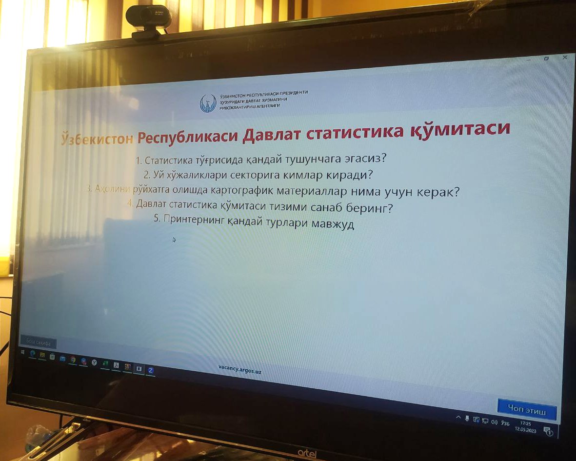⚡️Toshkent viloyati statistika boshqarmasida joriy yilning 12- may kuni Narx statistikasi bo‘limi yetakchi mutaxassisi va Angren shahar statistika bo‘limi bosh mutaxassisi lavozimiga test jarayonida yuqori ball to’plagan nomzodlar ochiq va mustaqil tanlovning suhbat bosqichida ishtirok etishmoqda.