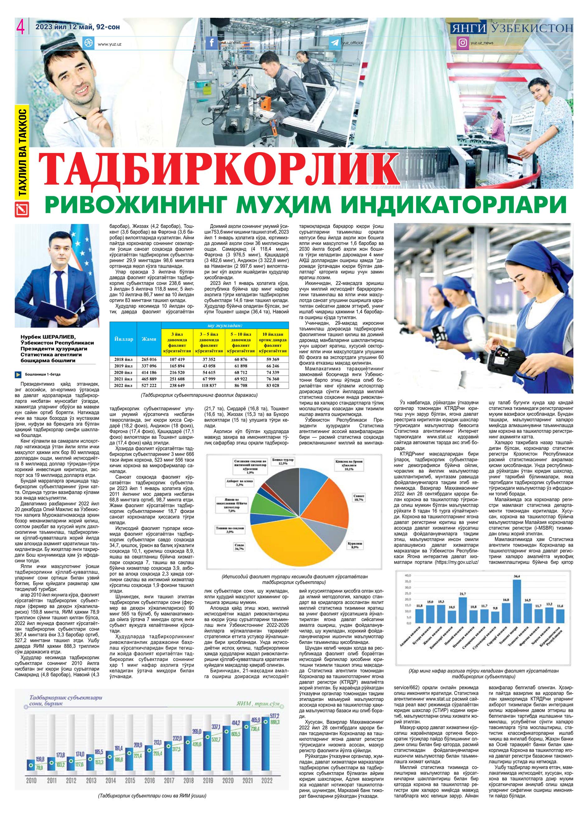 “Янги Ўзбекистон” gazetasining 2023- yil 12- maydagi 92- sonida Oʻzbekiston Respublikasi Prezidenti huzuridagi Statistika agentligi boshqarma boshligʻi Nurbek Sheraliyevning “Tadbirkorlik rivojining muhim indikatorlari” nomli maqolasi chop etildi.