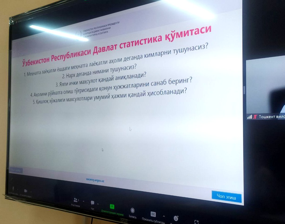 ⚡️Toshkent viloyati statistika boshqarmasida joriy yilning 7- avgust kuni Kadrlar bo‘limi yetakchi mutaxassisi va Olmaliq shahar statistika bo‘limi bosh mutaxassisi lavozimiga test jarayonida yuqori ball to’plagan nomzodlar ochiq va mustaqil tanlovning suhbat bosqichida ishtirok etishmoqda.