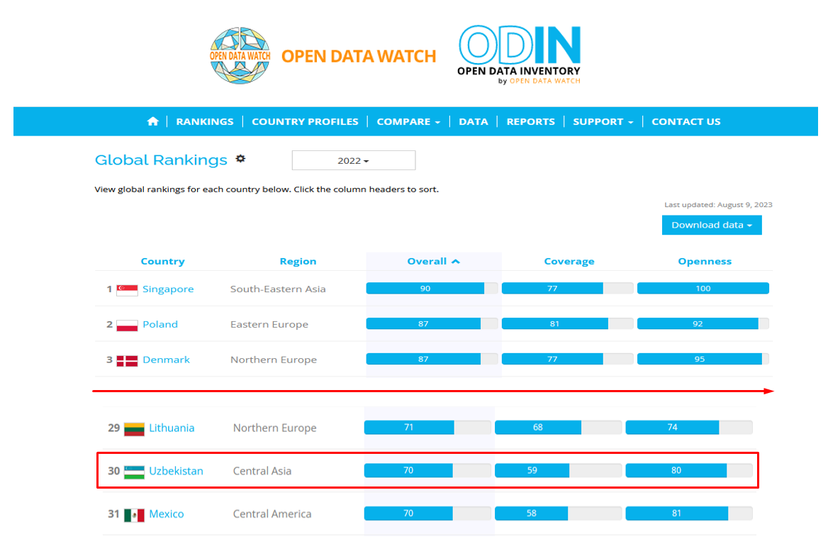 Oʻzbekiston Respublikasi Open Data Inventory (ODIN) ochiq ma’lumotlar reytingida 70 ball toʻplagan holda dunyoda 30-oʻringa ko‘tarildi. Mazkur natija mamlakatimizda ochiqlik sohasida amalga oshirilayotgan islohotlarning yaqqol ifodasidir. Open Data Inventory (ODIN) ochiq ma’lumotlar reytingida 195 ta mamlakat baholandi.