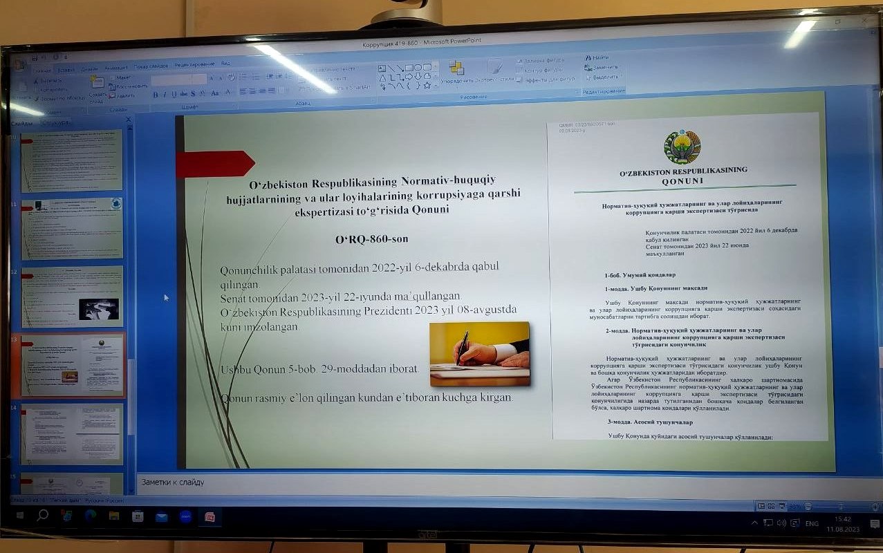 2023-yilning 11-avgust kuni Toshkent viloyati statistika boshqarmasida bosh yuriskonsult R.Gafforov tomonidan O‘zbekiston Respublikasining Korrupsiyaga qarshi kurashish to‘g‘risidagi O‘RQ-419-sonli Qonuni, O‘zbekiston Respublikasining Normativ-huquqiy hujjatlarning va ular loyihalarining korrupsiyaga qarshi ekspertizasi to‘g‘risidagi O‘RQ-860-sonli Qonuni, O‘zbekiston Respublikasi Jinoyat kodeksining tegishli moddalari hamda O‘zbekiston Respublikasi Vazirlar Mahkamasining 2023-yil 9-avgustdagi 349-sonli Toshkent metropolitenining yer usti yo‘li bekatlariga nom berish to‘g‘risidagi Qarori to‘g‘risida huquqiy targ‘ibot o‘tkazildi.