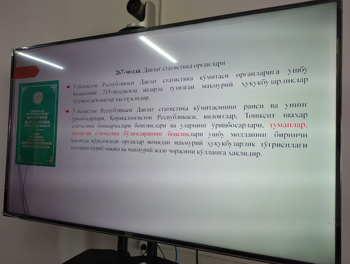 Joriy yilning 24-avgust kuni Toshkent viloyat statistika boshqarmasida navbatdan tashqari huquqiy targ‘ibot o‘quv seminari tashkil etildi. Unda hududiy statistika bo‘lim boshliqlari va xodimlari ishtirok etishdi.