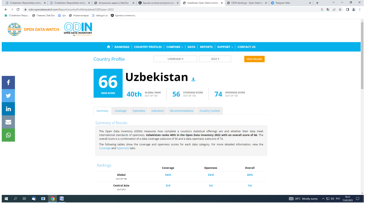 Oʻzbekiston Respublikasi Open Data Inventory (ODIN) ochiq ma’lumotlar reytingida 66 ballni toʻplagan