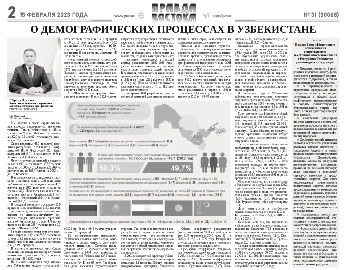 “Правда Востока” gazetasining 2023- yil 15- fevraldagi 31- sonida