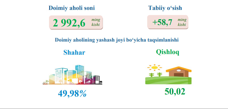 Dastlabki ma’lumotlarga ko‘ra, 2023- yil 1- yanvar holatiga doimiy aholi soni 2 992,6 ming kishini tashkil etib