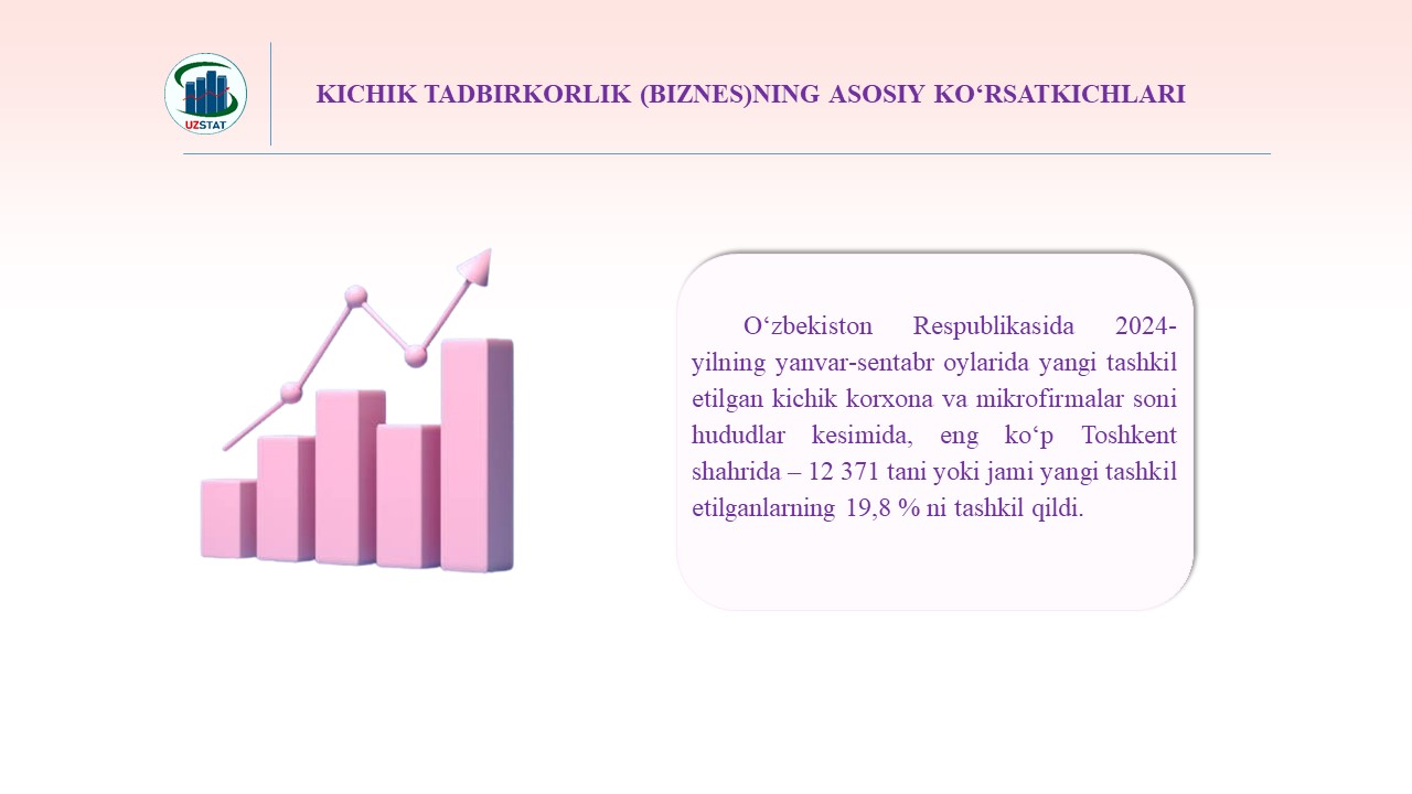 Viloyatimizda 2024- yilning yanvar-noyabr oylarida yangi tashkil etilgan kichik tadbirkorlik subyektlari (fermer va dehqon xo‘jaliklarisiz) soni 6 385 tani tashkil etgan bo‘lib