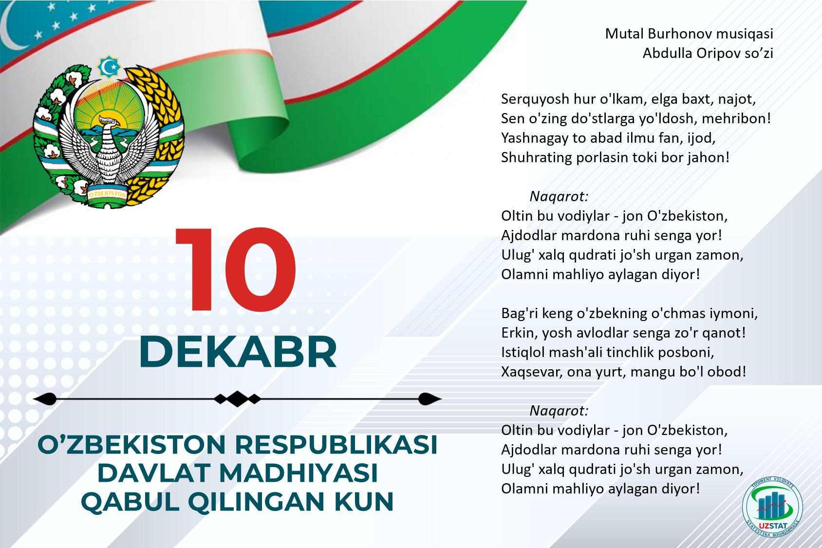 O'zbekiston Respublikasi Davlat madhiyasining matni va musiqasi O'zbekiston Respublikasining 1992-yil 10-dekabrdagi 768-XII-sonli «O'zbekiston Respublikasining Davlat madhiyasi to'g'risida»gi Qonuni bilan tasdiqlangan