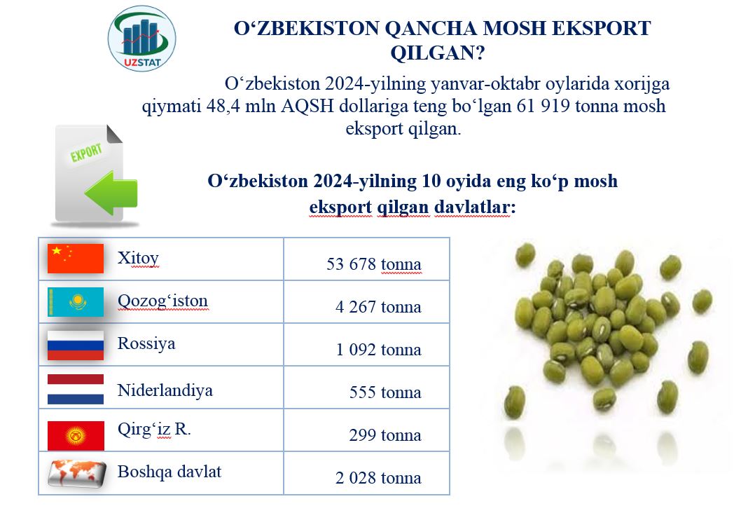 2024- yil yanvar-oktabr oylarida Toshkent viloyati bo‘yicha 1 mln AQSh dollariga teng 0,7 ming tonnadan ortiq yeryon-g'oqlar eksporti amalga oshirilgan
