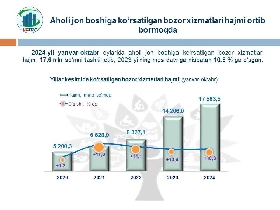 2024- yilning yanvar-oktabr oylarida Yuqori Chirchiq tumanida ko‘rsatilgan bozor xizmatlari hajmi 1 357,7 mlrd so‘mga yetdi