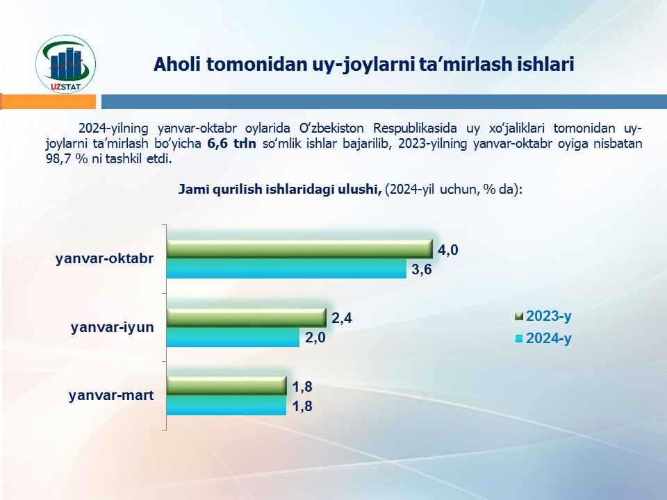 2024- yil yanvar-oktyabr oylarida viloyatda davlat mulkchiligidagi tashkilotlar tomonidan jami 397,0 mlrd so‘m qurilish ishlari bajarildi