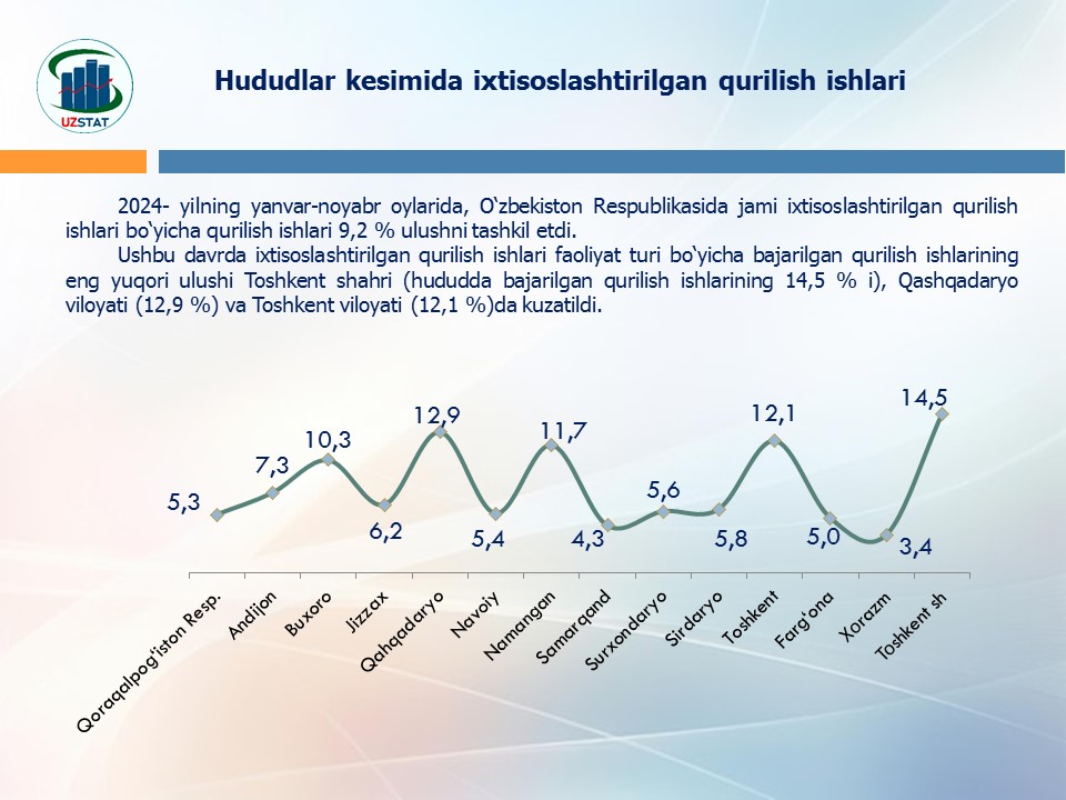 2024- yilning yanvar-oktabr oylarida Bo‘ka tumanida jami 228 mlrd so‘mlik qurilish ishlari bajarildi