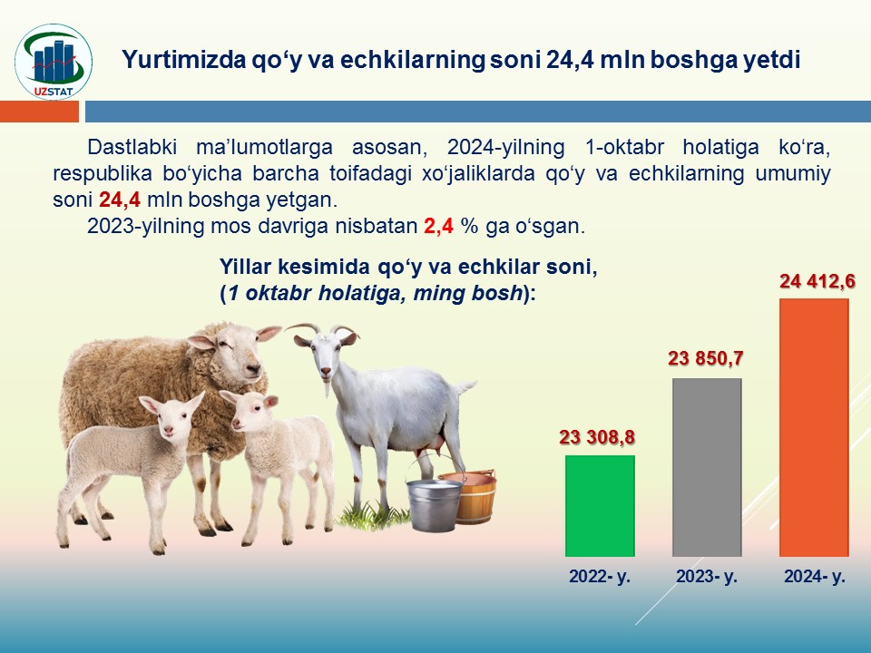 2024- yilning yanvar – sentabr oylarida Toshkent viloyatida barcha toifadagi xo‘jaliklar tomonidan 1 019,3 mln dona tuxum yetishtirildi