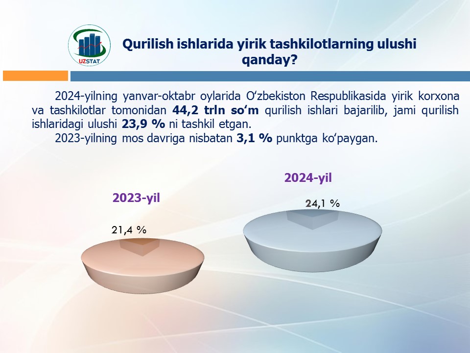 2024- yil yanvar-oktabr oylarida Toshkent viloyatida norasmiy sektor hissasiga to‘g‘ri kelgan qurilish ishlari ulushi 40,7 % tashkil etdi