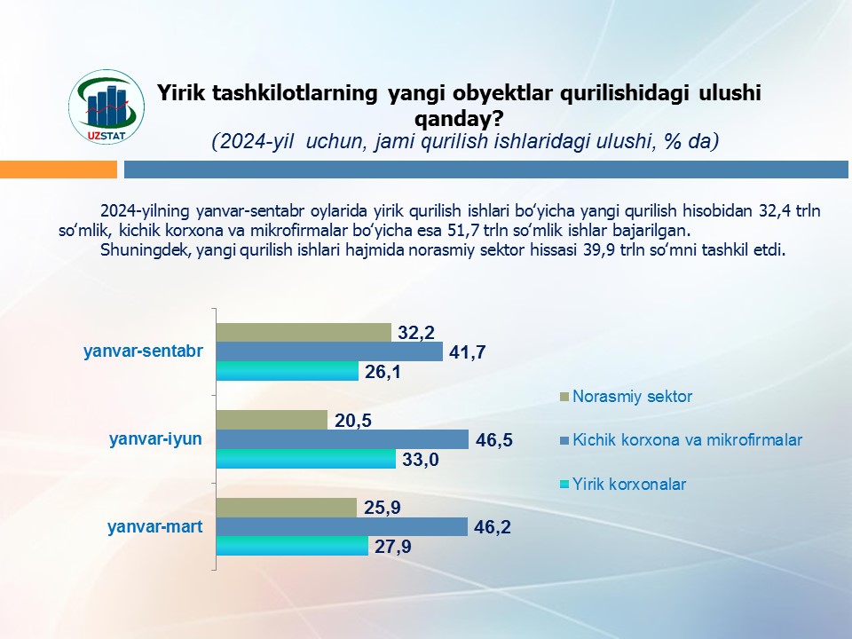 2024- yil yanvar-sentabr oylaridaToshkent viloyati bo‘yicha asosiy kapitalga investitsiyalarning texnologik tarkibida qurilish-montaj ishlari bo‘yicha 26 494,4 mlrd so‘m